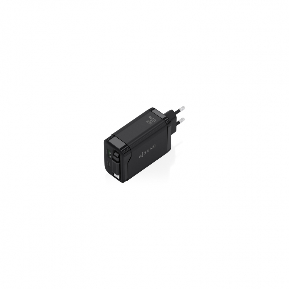 AISENS Cargador GaN 65W, 1xUSB-C Cable Retractil, 1xUSB-C PD3.0, 1xUSB-A QC3.0, Negro