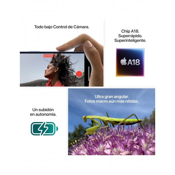 - Control de Cámara. Haz la foto perfecta. Sin apenas mover un dedo - Chip A18. Personal en cada detalle - ¿Un subidón en autonomía? Marchando - Nuevo ultra gran angular. Lleva tus fotos más allá. Y más acá - iOS 18. Personal en cada detalle
