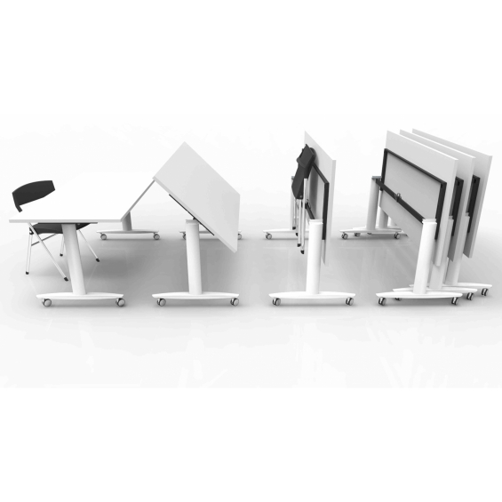 Mesa multifuncional blanca 160x80cm. Patas y tablón blancos. Partas con ruedas, dos de ellas con freno y tablón abatible. Madera reciclada con certificado FSC. Tablón de 25mm de grosor con 3mm de cantos ABS