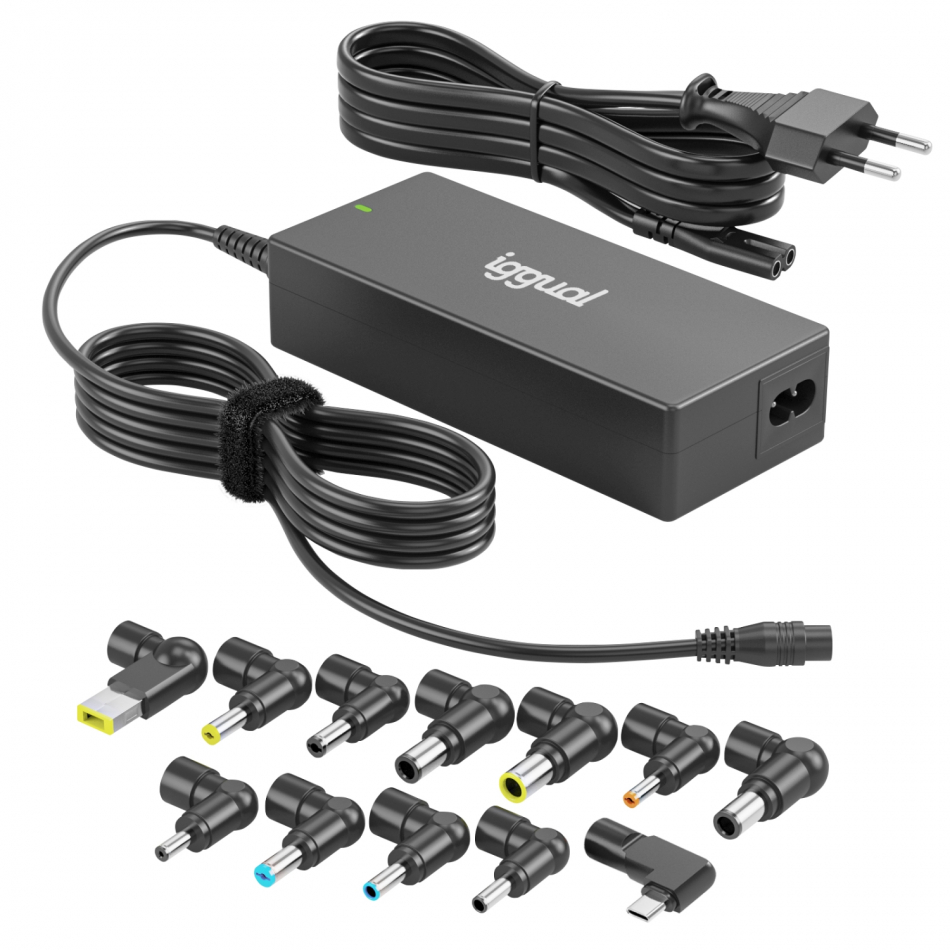 - El iggual CUA-C-12T-90W es un cargador universal automático de 90W diseñado para ofrecer la máxima versatilidad y seguridad. Su puerto USB Tipo C con Power Delivery y las 12 clavijas DC incluidas lo hacen compatible con una gran variedad de portátiles y dispositivos.