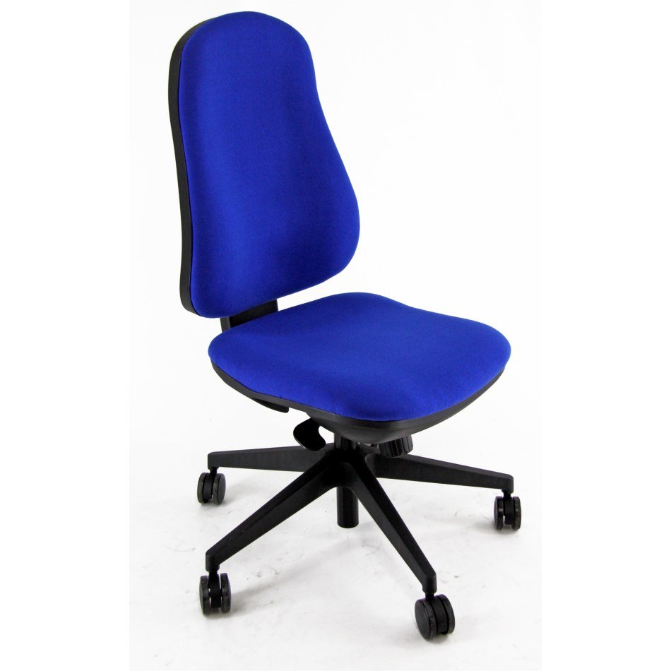 Silla Administrativa Ariel tapizada en color azul tanto en asiento como respaldo. Mecanismo sincronizado, respaldo alto con soporte lumbar. Asiento ergonómico. Base extra grande de 68cm de diámetro de NYLON de cinco radios. Reposabrazos opcionales no incluidos. Cumple con normativa EN1335 y certificación TUV