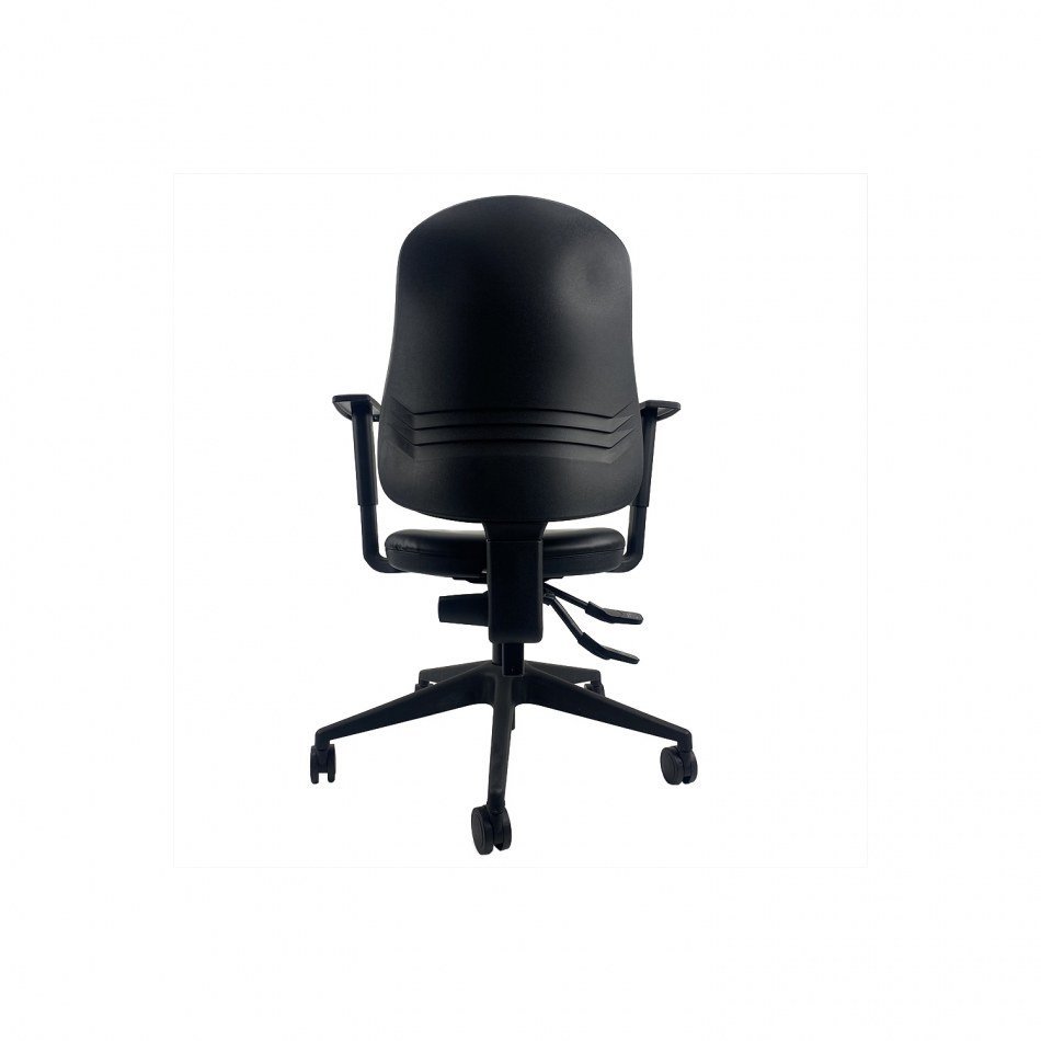 Silla Administrativa SIMPEL tapizada en asiento y respaldo color roja. Contacto permanente con respaldo alto y soporte lumbar. Reposabrazos ajustables en altura incluidos. Base negra . Cumple con normativa EN1335 y certificación TUV